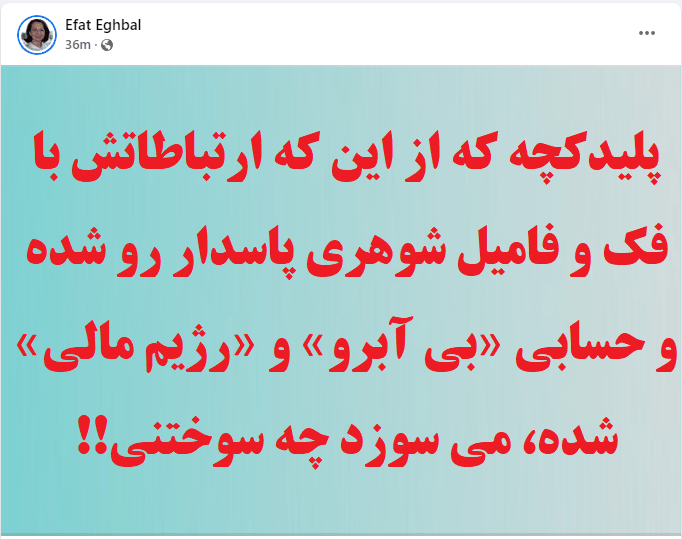 November 30, 2022November 30, 2022 messagefromiran بى آبرو و رژيم مالى شدن پليدكچه پليدكچه كه از اين كه ارتباطاتش با فك و فاميل شوهرى پاسدار رو شده و حسابى «بي آبرو» و «رژيم مالي» شده، مي سوزد چه سوختنى Share thisبه اشتراك بگذاريد Share on X (Opens in new window) X Share on Facebook (Opens in new window) Facebook Email a link to a friend (Opens in new window) Email Print (Opens in new window) Print Share on LinkedIn (Opens in new window) LinkedIn Share on Reddit (Opens in new window) Reddit Share on Tumblr (Opens in new window) Tumblr Share on Pinterest (Opens in new window) Pinterest Share on Pocket (Opens in new window) Pocket Like Loading...
