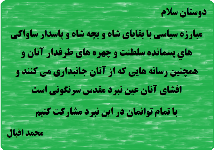 مبارزه سياسي با بقاياي شاه و بچه شاه و پاسدار ساواكي هاى پسمانده سلطنت و چهره هاي طرفدار آنان و همچنين رسانه هايي كه از آنان جانبداري مي كنند و افشاي آنان عين نبرد مقدس سرنگوني است