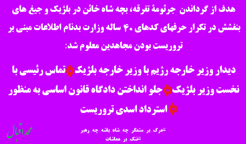 هدف از گرداندن جرثومهٔ تفرقه، بچه شاه خائن در بلژيك و جيغ هاي بنفشش در تكرار حرفهاي كدهاي 40 ساله وزارت بدنام اطلاعات مبني بر تروريست بودن مجاهدين تروريست معلوم شد: